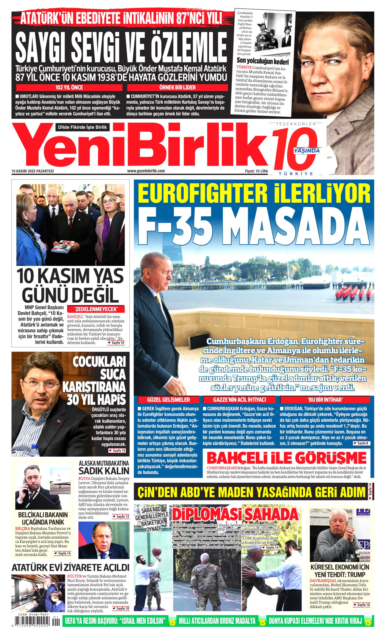 YENİBİRLİK Gazetesi 10 Kasım 2025, Pazartesi Günü Manşeti